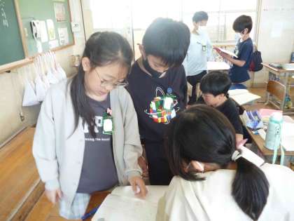 国語で「時計の時間と心の時間」という説明文の学習をしています。今日は、話を読んで疑問に思ったことや筆者の考えに対して自分はどう考えたのかを書きました。友達とも積極的に意見交換をしていました。