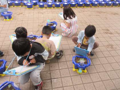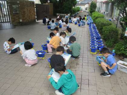 今日はあさがおの観察をしました。子どもたちは毎日昨日との変化を見に行ったり、水やりに行ったりと大切にあさがおを育てています。大切に育てていることもあり、種を植えてから10日が経って、全員のあさがおが芽をだしました。色や形、大きさ、手触りなどに注目しながらかんさつカードに書くことが出来ました。
