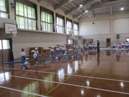体育科の学習では、「まねっこあそび」を進めています。前の人が動いた動きを後ろの人が真似をしながら、走ったり、這ったり、転がったりという動きを楽しんで学習しています。まだまだ動きは上手に真似できませんが、これから学習を進めていろいろな動きができるようにしていこうと思います。