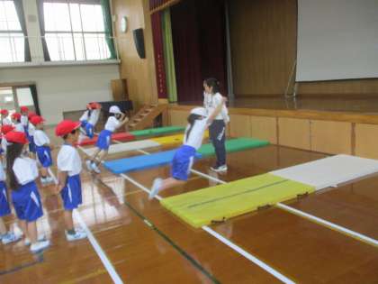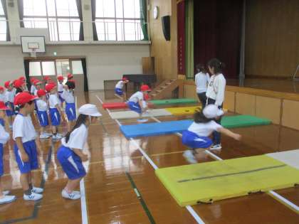 体力テストで立ち幅跳びの測定を行いました。子どもたちみんなで「いっせーのーで」の声をかけて腕を振り、思いきり踏み込んで跳びました。子どもたちは「すごく跳べた」と大喜びでした。