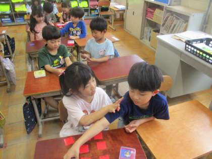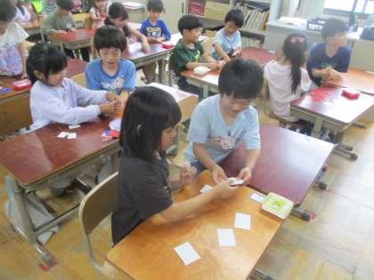 今日の算数科は、「いくつといくつ」の学習をしました。カードを2枚めくって、2まい合わせて10の数を作りました。子どもたちはペアで盛り上がりながら、学習をしていました。昨日から宿題の「いくつといくつ」カードが始まりました。また子どもたち一人ひとり言うことができるかどうか聞きますので、おうちでもまた聞いてあげてください。