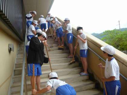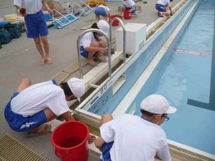 27日(月)にプール掃除をしました。更衣室・プール前階段・プールサイド・プールの床など役割分担をし、それぞれの場所を丁寧に掃除してくれていました。子どもたちは、掃除の終わったプールを見て、さらに水泳学習への意欲が高まったようです。