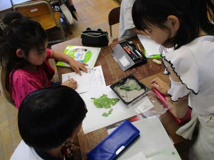 モンシロチョウの幼虫をじっくりと見て観察をしています。