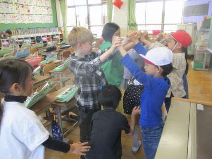 音楽ではリズムあそびをしたり、曲にのって遊んだりしています。みんなで橋を作って通る「ロンドン橋」は.とても楽しかったようです。
