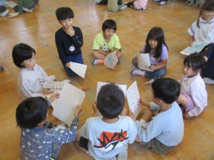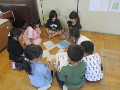 国語科では、「こんなもの見つけたよ」の学習をしました。生活科の学校探検で見つけてきた自分の一番のお気に入りのものを絵に描いて発表しました。グループごとに分かれて、相手の顔を見たり、頷いたりと聞き方を意識しながら友だちの発表を聞きました。
