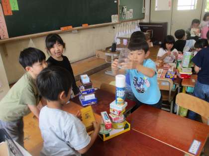 「積み木」の形を見て、箱や筒、ボール型(まる)という形の学習をしていきます。今日は自分たちで持ってきた箱を積んで、積みやすい形や、形の特徴を考えました。子どもたちは楽しみながらも「高く積むにはこの形が積みやすい。」など特徴をとらえていました。箱のご用意ありがとうございました。