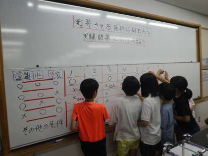 実験結果から、発芽には、適当な温度・水・空気の3つが必要であることが分かりました。