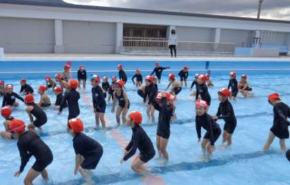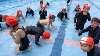 晴れ間が少なく、寒く感じる日となってしまいましたが、低水位での水遊びを行いました。今日はプールでの約束を確認し、水慣れ、真似っこ遊びなどをしました。次は、お天気よく気持ちよく入れるといいですね!