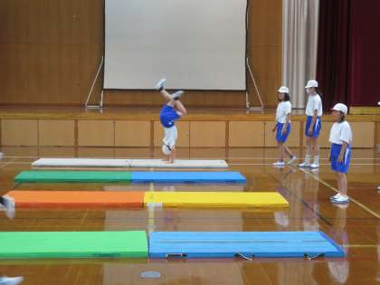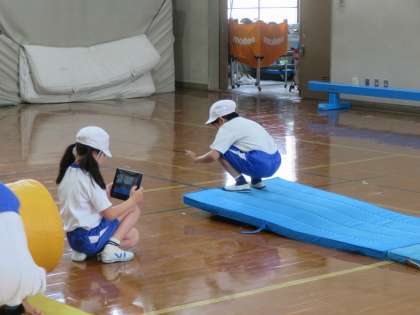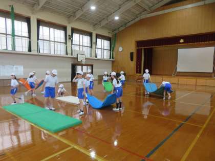 体育の学習でマット運動が始まりました。準備片付けも自分たちで協力して、声を掛け合いながら進めています。子どもたちは、GIGA端末も利用しながら、出来る技を増やしていこうと努力しています。