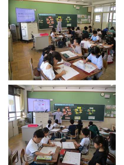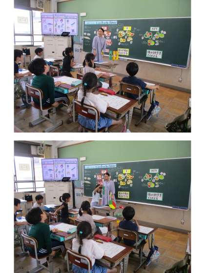 栄養の先生の特別授業を,クラスごとに受けています。