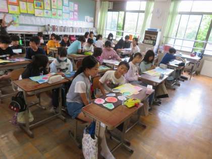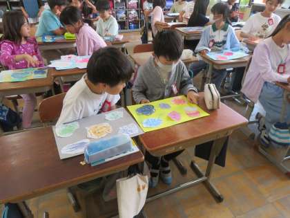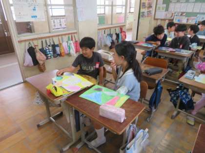 図画工作科の学習で描いた、それぞれの「心のもよう」を見せ合いながら、感想を伝え合いました。作者の考えと見た人の感じ方には大きなズレがあることに気付き、その違いも楽しんで交流していました。