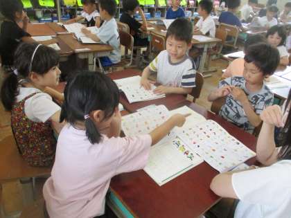 今日の国語科の「あいうえおであそぼう」では、ひらがな表をたてやよこで読んだり、しりとりをしたりして、楽しく学習を進めました。本日は休日参観ありがとうございました。子どもたちはみんなとても張り切って頑張っていました。月曜日は代休日ですので、ゆっくりと休ませてあげてください。