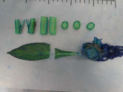 根から吸い上げられた水の通り道を調べました。