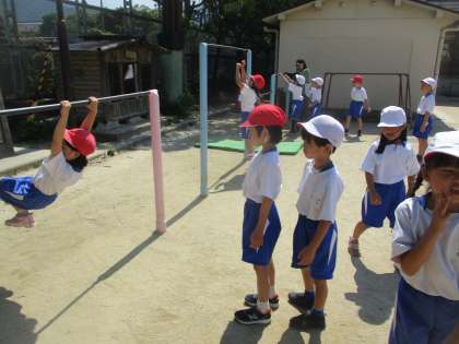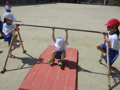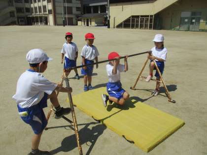 体育科の学習では、みずあそびと並行して、鉄棒遊びの学習を進めています。学習の初めはぶらさがりやとびあがり、とびおりなど基本な技をしながら鉄棒の手の握りを確認しています。これからまた上がる、下がる、ふるなどの技をどんどん進めていきます。