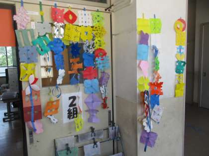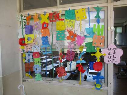 休日参観の際にはさみの使い方や基本的な練習を見ていただいた「ちょきちょきかざり」が完成しました。つながる飾りや細かい飾りなど、思い思いの楽しい飾りが完成しました,教室や廊下に飾って華やかに明るくなりました。