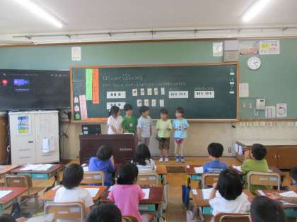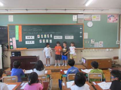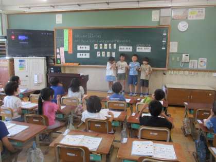 音楽科では「はくにのってリズムをうとう」の学習で、「はく」の学習をしています,「たん、たん、たん、うん」と「た、た、た、た、たん、うん」の2つのリズムと3文字の言葉、5文字の言葉を組み合わせて言葉でリズムをつくりました。子どもたちは2つのリズムの違いを楽しみながら、楽しくリズムをつくっていました。