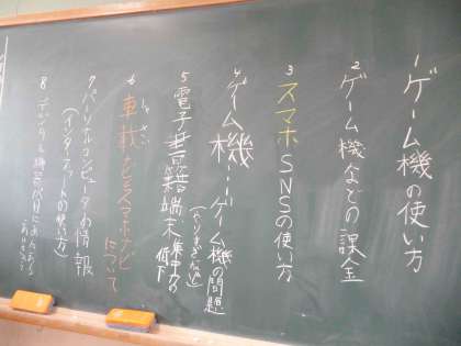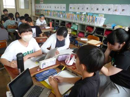国語科で、「デジタル機器と私たち」という学習をしています。身の回りのデジタル機器について振り返り、どのような課題があるのかやみんなに提案したいことなどを班で考えています。今後は、班で資料を作り発表する予定です。