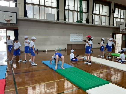 水泳学習と並行して、マット運動の学習も行っています。全身を使って随分いろいろな技ができるようになってきました。自分の動きを確認するために動画を撮り合って、少しでも美しくなるようにはどうしたらいいかを考えながら練習しています。