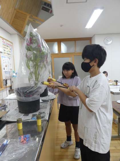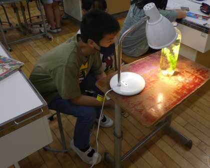 また、オオカナダモに光を当て、酸素を多く含んだ泡が茎の切り口から出てくることも確認しました。