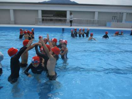 今日は水遊びの学習をしました。前回までの低水位の学習とは違い、少し水位の上がったプールで「うく」「もぐる」などの活動を行いました。久しぶりのプールで子どもたちはとても楽しそうに学習をしていました。