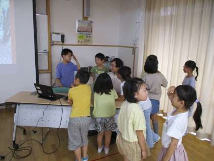 お話の合間の休憩では、1人が話しかけに行くと、どんどん友だちが集まり、吉野博士のまわりに自然と輪ができていました。