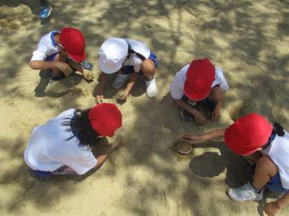 生活科の「なつとともだち」の学習では、「夏ならではの遊びやもの」をテーマに学習を進め、雨の日探検に出かけたり、花草遊びをしたりして学習を進めています。今日は、砂や水遊びをし、子どもたちは全力で遊び、全力で夏を感じていました。着替えのご準備ありがとうございました。
