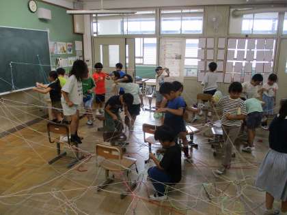 さまざまな色の紐や毛糸などをたくさんつないで,自分たちだけの特別な空間を作って楽しむ活動をします。