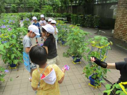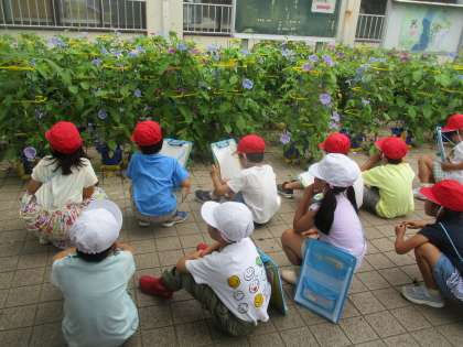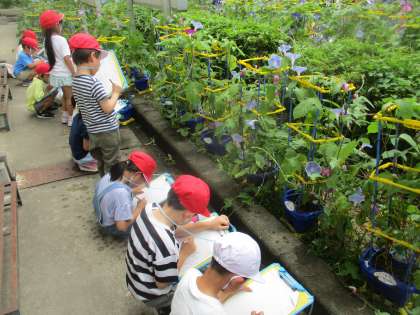 今日は夏休み前最後のあさがおの観察をしました。1学期の間、水やりや声掛けなど毎日気にかけて育てた朝顔はたくさんの花を咲かせ、子どもたちと同じぐらいの高さまでつるを伸ばしました。観察カードもたくさん書き、1学期の間で上手に書けるようになりました。明日からの個人懇談会で教室に掲示していますので、ご覧ください。また子どもたちには伝えていますが、夏休み明けの「色水遊び」の学習のために持ち帰った後に咲いた花を摘み、冷凍してお持ちいただけたらと思います。
