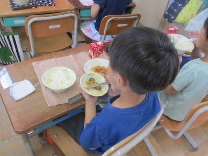 今日の給食には、新献立の「夏野菜の焼きびたし」がでました。夏が旬のかぼちゃ、なす、オクラをスチームコンベクションオーブンで焼いた後、だしで煮て、形もきれいに仕上げられています。野菜の甘みが引き立っていたので、「いつもより野菜が美味しい。」「甘い。」と言いながら、子どもたちも嬉しそうに食べていました。