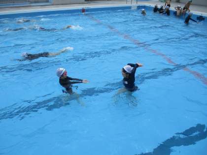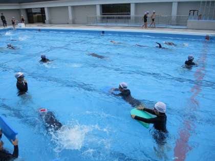 友だちと一緒に練習をしたり、みんなでどこまで泳げるか泳力検定をしたりしています。