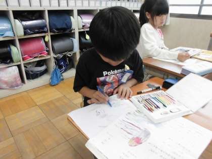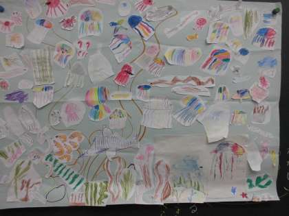 国語の学習「スイミー」のお話の世界に出てくる海の中をみんなで描いてみました。にじ色のくらげ、見たことのない魚たち・・・。素敵ですね。