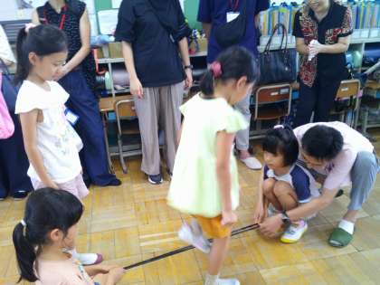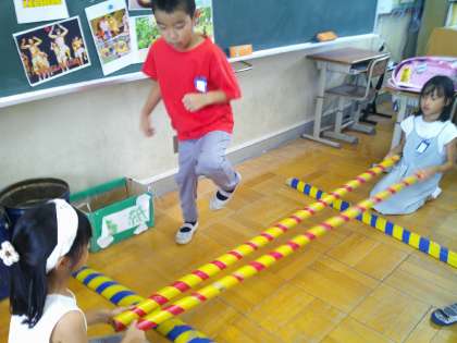 フィリピンの伝統的なあそび「ティニクリン」(バンブーダンス)をやってみました。少し難しくて、引っかかる子もいましたが、失敗してもニコニコ笑顔の子ども達でした。世界のことを知ることは楽しいですね。