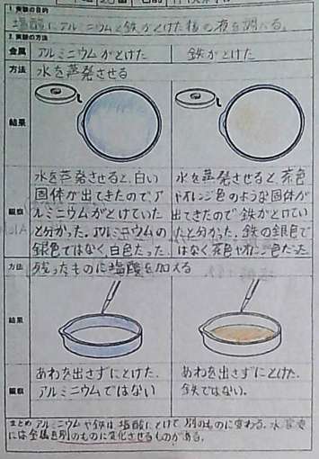 今回、試験管の中の様子を見ると、アルミニウム棒は、細くなったり、なくなっていたりしました。鉄のワッシャーは、アルミニウムよりとけにくかったのですが、うすくなっていました。