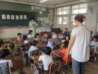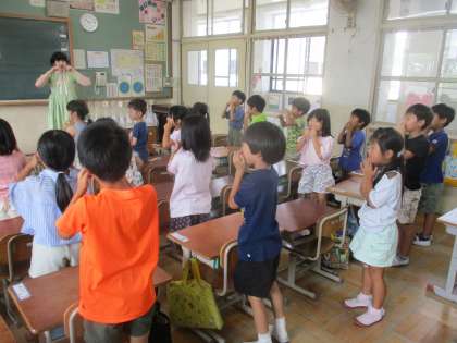 今日は初めての英語活動の授業でした。ALTの先生にも来てもらい、挨拶の仕方を練習したり、歌を歌ったりと楽しく学習をしました。子どもたちもジェスチャーを交えながら笑顔で「Yes!」「OK!」など元気に返事をしていました。