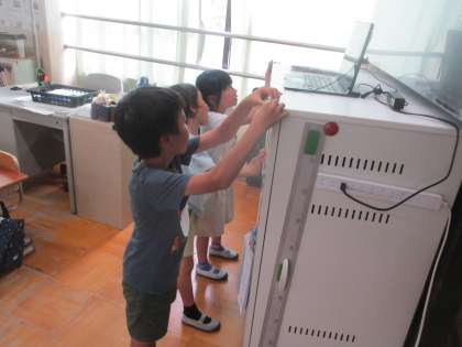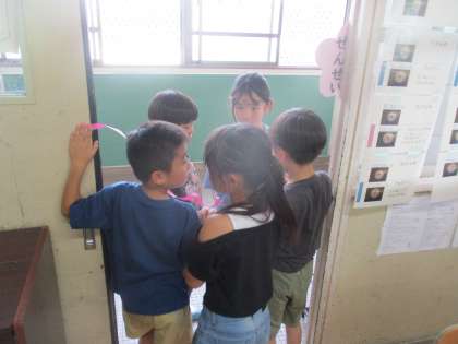 算数科の学習は「おおきさくらべ」の学習を進めています。今日は紙テープを使って大きくて動かせないものが教室の入り口から出せるのかを調べました。端をそろえる、まっすぐぴんと伸ばすなど長さを比べるときのポイントをおさえながら楽しんで長さを比べていました。