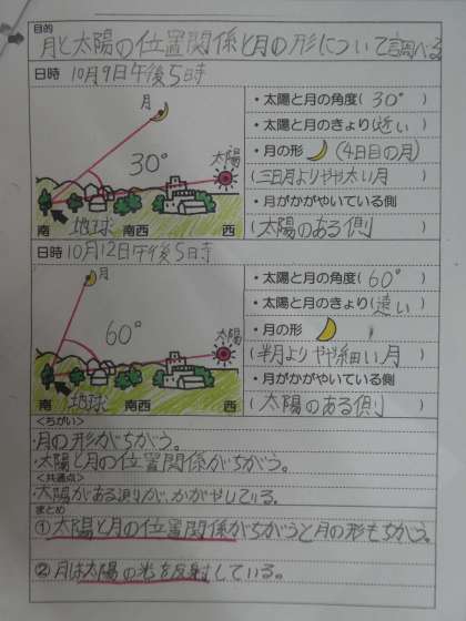 ある日の観察記録をもとに、月と太陽の角度の変化や月の形の変化を確かめました。
