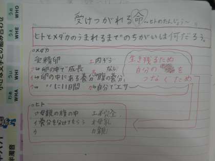 ヒトの赤ちゃんは、メダカの赤ちゃんとどこが違うのかについて、いくつかのポイントに分けて調べていきました。まだ、分からないところも多くあり、これからもっと調べることになりました。