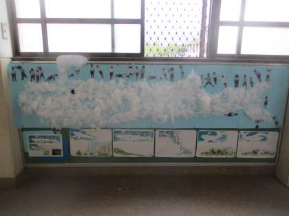 「天までとどけ、一、二、三。」と息を合わせてジャンプ!!一年二組のみんなでくじらぐもの上にのりました。それぞれがくじらぐもにどんな風にのりたいかを想像して、思い思いのポーズでくじらぐもにのっています。