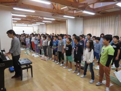 松下先生に美しい声の出し方を教えてもらいながら、学年で歌の練習を始めました。