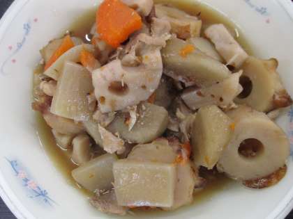 筑前煮には、秋においしい「ごぼう」や「れんこん」を使いました。給食室に届くごぼうやれんこんは、スーパーでよく見る大きさではなく、70センチメートルほどあります。それを調理員さんが、よく洗い、皮をむき、包丁でせっせと切っていきます。筑前煮には、ごぼうやれんこんのほかに、とり肉やちくわ、にんじん、こんにゃくが入ります。お肉や野菜のうま味が合わさって、おいしく、さまざまな食感を味わうことができました。