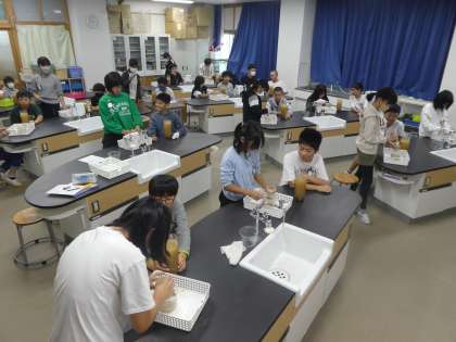 みんな、海に見立てたペットボトルの底に、地層ができる様子を熱心に観察していました。