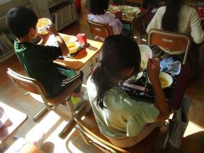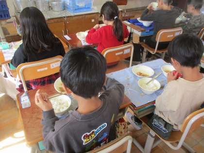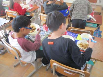 今日の給食は、新献立の「鶏肉のきのこごま甘酢あんかけ」がでました。油で揚げた鶏肉に、旬のしいたけ、エリンギ、玉ねぎ、ごまを使った甘酢あんをかけた新しい献立です。旬のものがたくさん入っていて、秋の訪れを感じながら味わって食べました。