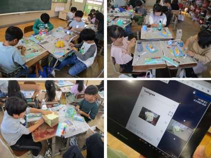 図画工作科の学習で,空き容器に紙粘土や飾りをつけて小物入れを作ります。