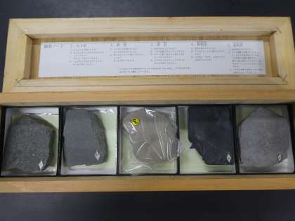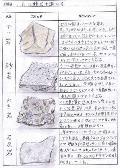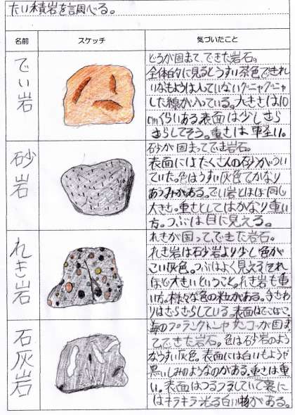 地層を作るどろ・砂・れきがそれぞれ固まって岩になったものが「たい積岩」であることを学習した後、それぞれのたい積岩について、粒の様子や色、重さなどを調べました。