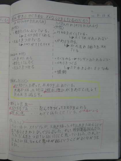 堤防や遊水地、砂防ダムなど、みんなで調べたことについて意見を出し合いました。