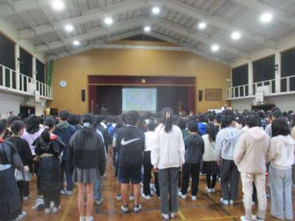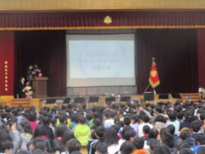 今日は40周年を祝う会を行いました。校長先生の話を聞いたり、上級生の発表を見たりしました。1年生も校歌や「いつだって」の歌は岩倉南の一員として明るく大きな声で歌っていました。40周年キャラクターも発表されてみんな大喜びでした。記念品として、冊子とバッジを持ち帰っていますので、またおうちで一緒に見てください。