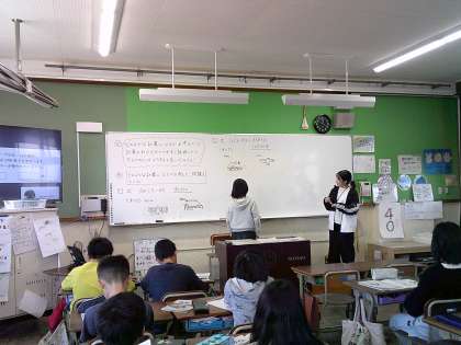 算数科の学習では、なぜこの式になるのか説明をする練習をしています。子どもたちは、図や文章を用いながら一生懸命に自分の考えを説明していました。