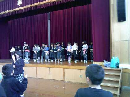 実際に前だれをかけ、1クラスずつ踊ってみました。最後には前だれのたたみ方まで教わりました。とても有意義な時間となりました。