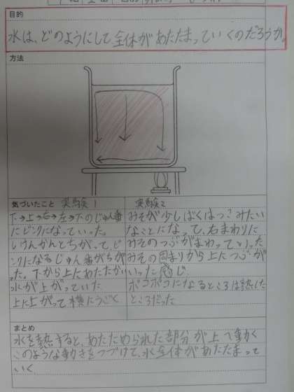 ビーカーの底を温めると、あたためられた水が上に移動することにより、水が上から温まっていくことが分かりました。