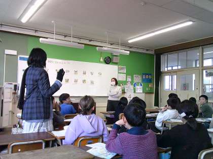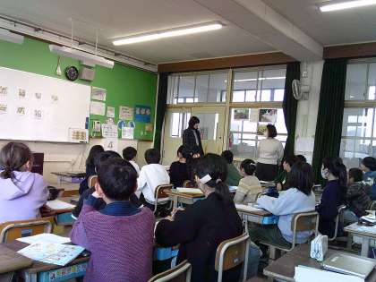 外国語の学習では、自分のお気に入りの場所を紹介する学習を行っています。「まっすぐ進む。」、「右、左に曲がる」の表現を楽しく学んでいました。